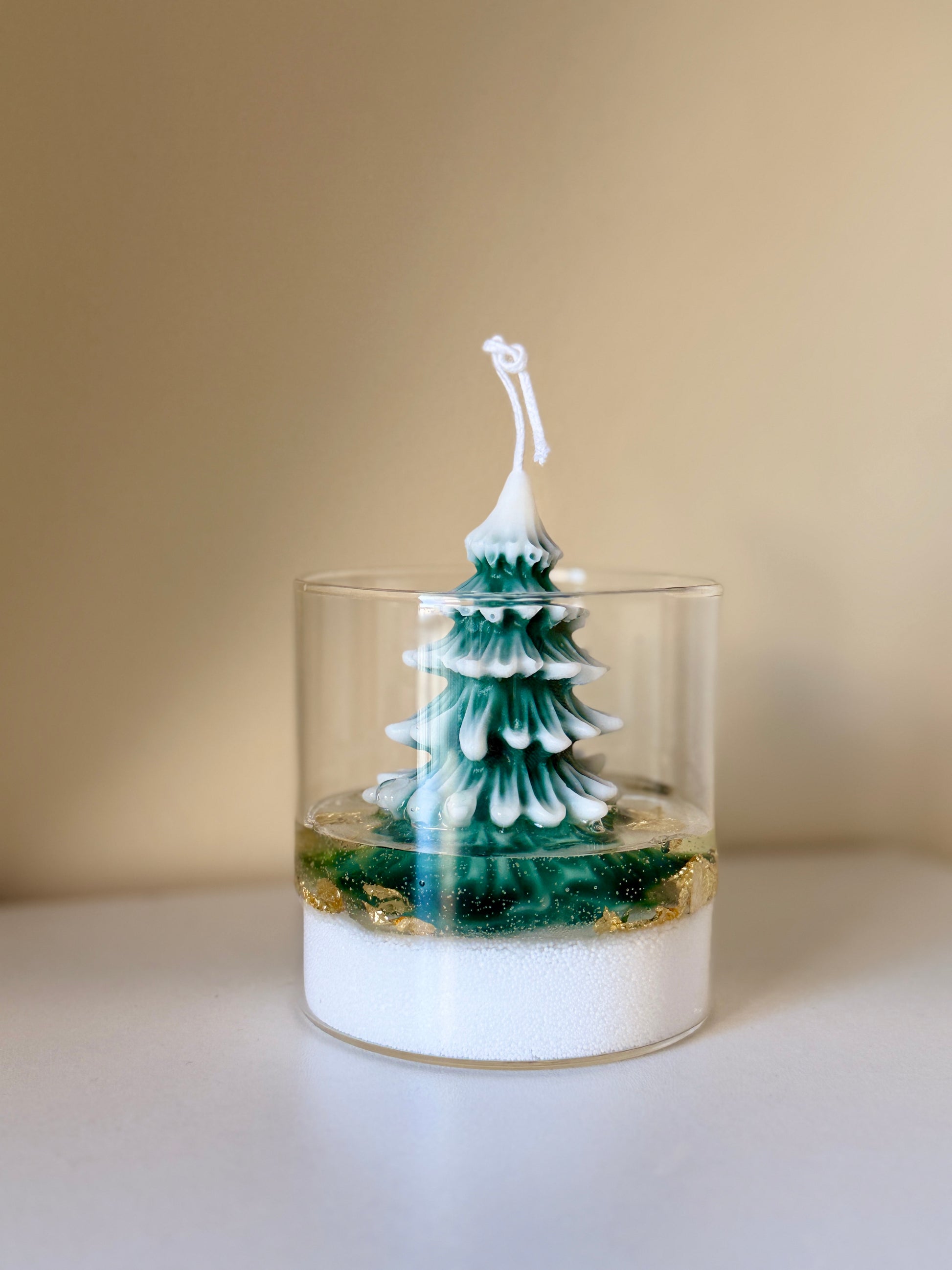 The candle is packaged in a smooth and transparent glass jar, shaped like a textured evergreen tree, with deep forest green and soft white colors (mimicking the effect of frost on winter leaves). This glass jar adds extra magic: there is a layer of "snowflake" beads at the bottom, along with sparkling gold foil and subtle bubbles that can capture light - when ignited, it becomes a glowing core decoration.